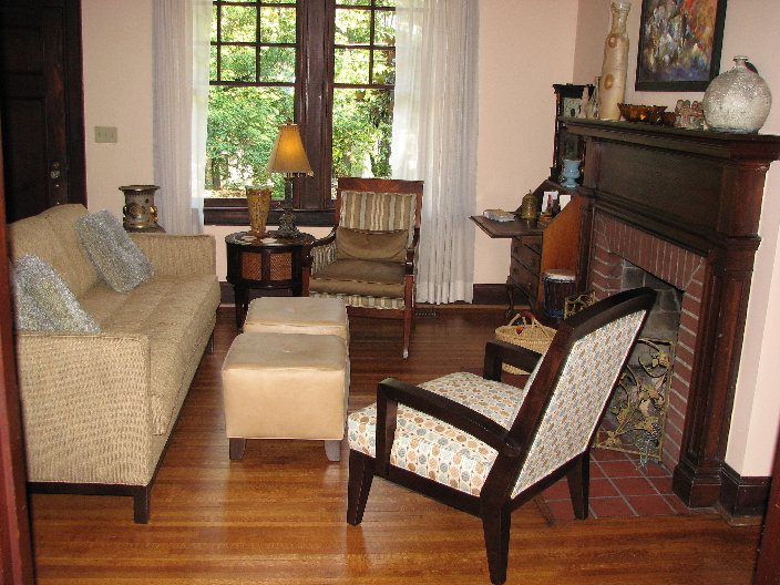 Downstairs Interior This spacious Living Room is divided into separate conversation areas and features original tiger oak flooring and a