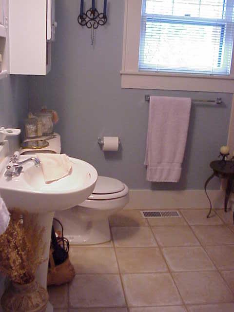 The bath has been totally updated with neutral ceramic tile and a pedestal sink |